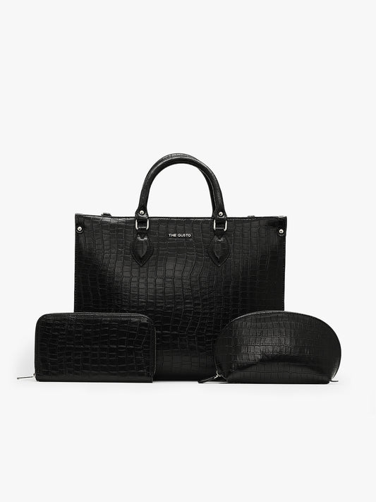Celeste Tote + Croco Wallet + Cosmos Croco Pouch Black