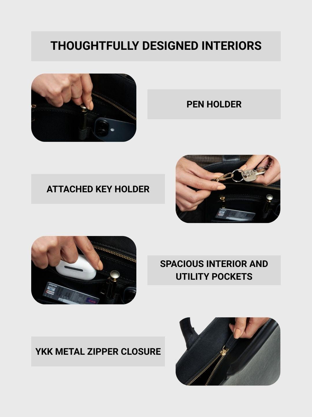 Thoughtfully designed with multiple pockets and compartments help keep everything organised, so your phone, wallet, keys, and cosmetics each have a dedicated place.