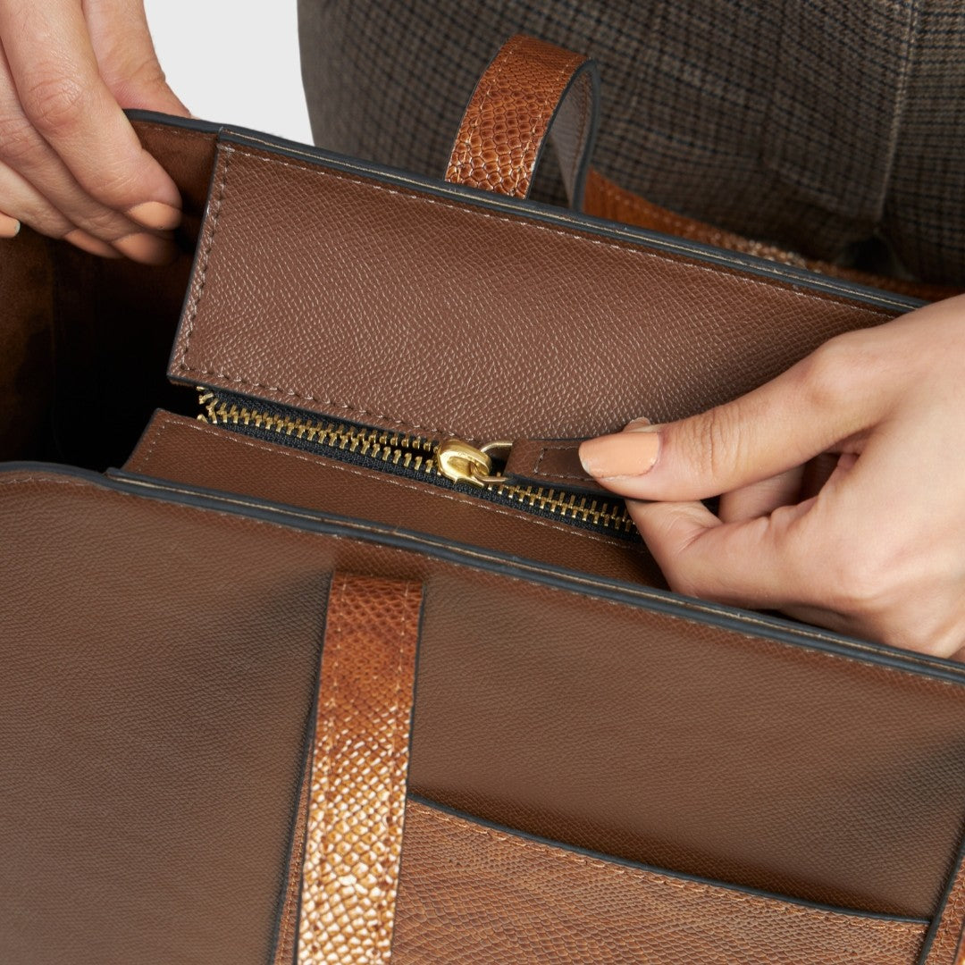 Nexus Tote is designed with multiple pockets and compartments help keep everything organised, so your phone, wallet, keys, and cosmetics each have a dedicated place.