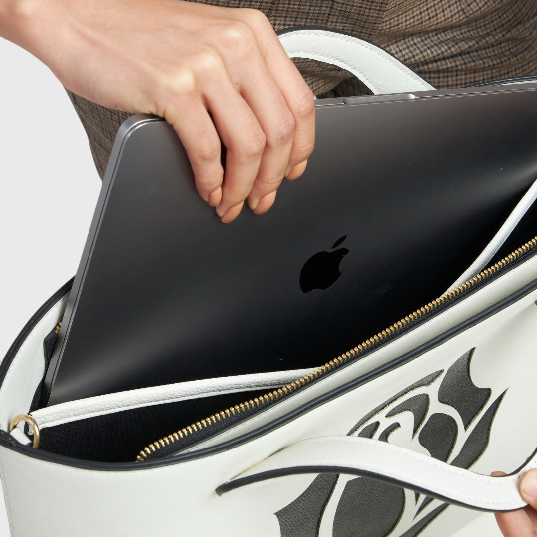 The Playdate Tote Bag is crafted with innovative laser technology for a modern edge. This spacious tote bag excels in organization for professionals balancing work and daily essentials with effortless style. The interior of the bag can hold notebooks and tablet. Interior pockets securely hold phone, power-bank, pens, cards, cash, and a zip compartment for medicines, complemented by a practical key holder for quick access. The padded 13-inch laptop sleeve provides superior protection. The detachable sling with sturdy metal hook offers versatile carrying options for any occasion and premium YKK metal zipper closure.