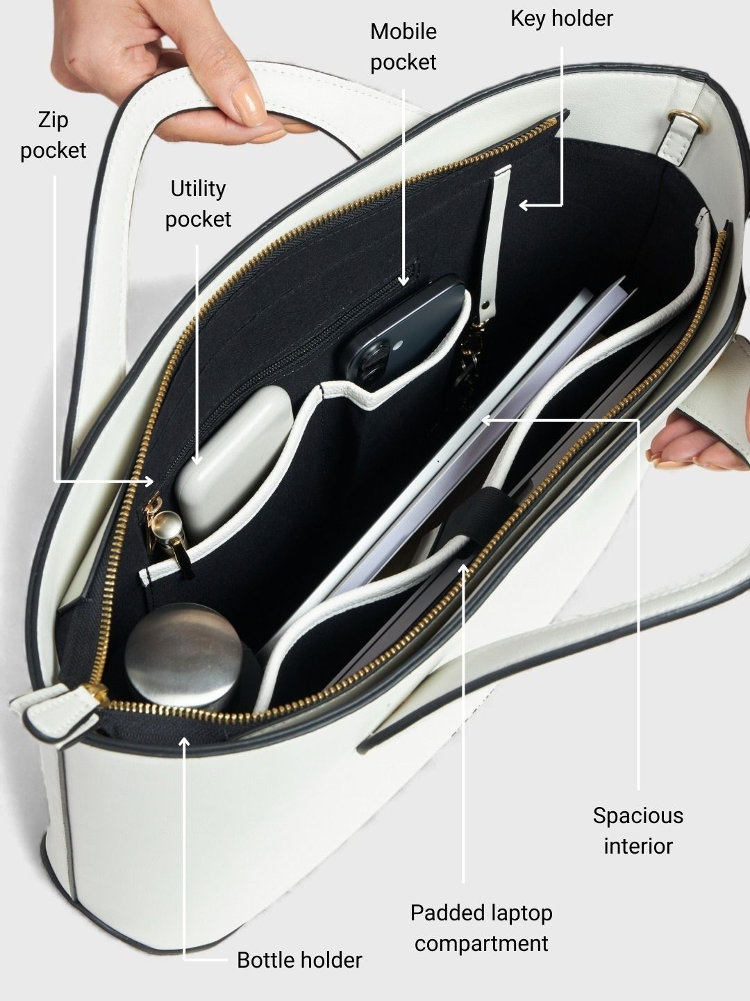 The Playdate Tote Bag is crafted with innovative laser technology for a modern edge. This spacious tote bag excels in organization for professionals balancing work and daily essentials with effortless style. The interior of the bag can hold notebooks and tablet. Interior pockets securely hold phone, power-bank, pens, cards, cash, and a zip compartment for medicines, complemented by a practical key holder for quick access. The padded 13-inch laptop sleeve provides superior protection. The detachable sling with sturdy metal hook offers versatile carrying options for any occasion and premium YKK metal zipper closure.