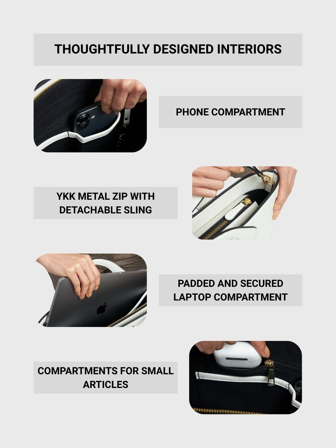 The highest quality YKK metal zipper offers superior durability and smooth functionality that stands the test of time with easy to use detachable sling.